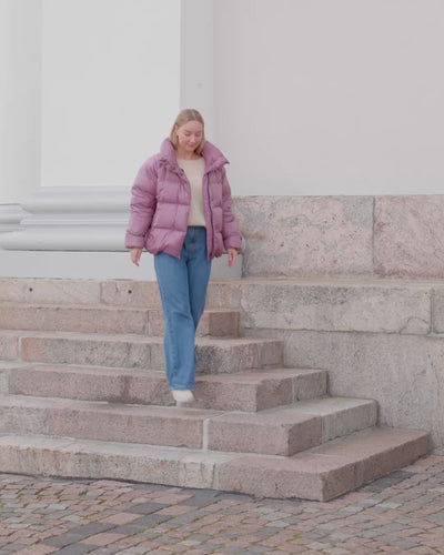 Det rena dunfyllningen håller dig varm men känns drömlikt lätt. Raglanärmar och en ledig passform ger rörelsefrihet och gör det enkelt att klä sig i lager. Den höga skorstenkragen skyddar mot vinden men fungerar också som en stilfull krage när du vill variera din look.