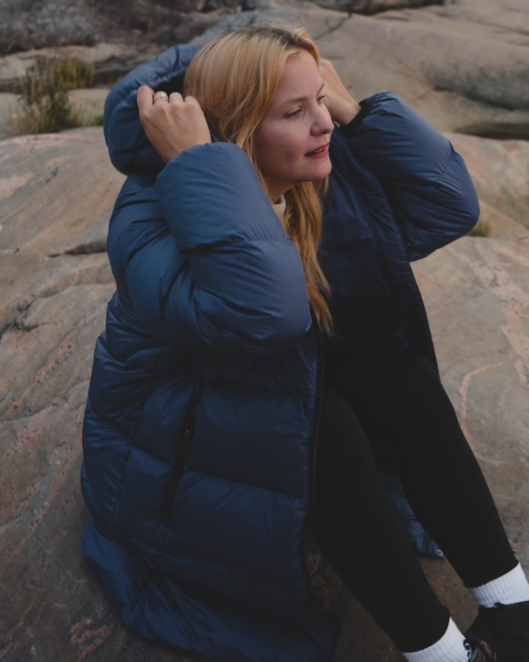 stormskärVattenavvisande och vindtäta Silvia är en ultra light och varm dunjacka som passar för användning under hela vinterhalvåret. Jackan kan smidigt rullas ihop i sin innerficka vilket gör den till en självklar favorit att ta med på skid- eller vandringsresan. Fast huva och dragsko i midjan bidrar till extra värme. Silvia är en längre version av Joutsens klassiska Tauko dunjacka. Fylld med 100 % ansvarsfullt producerat dun.