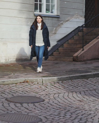 Venla-dunjackan är en lätt men varm följeslagare för omväxlande vinterdagar. Den långa, raklinjiga modellen känns behagligt andningsbar i mildare väder och ger ett mjukt skydd när vinden tilltar eller kylan biter till. Den vackra indigoblå nyansen tillför färg till vintergarderoben.